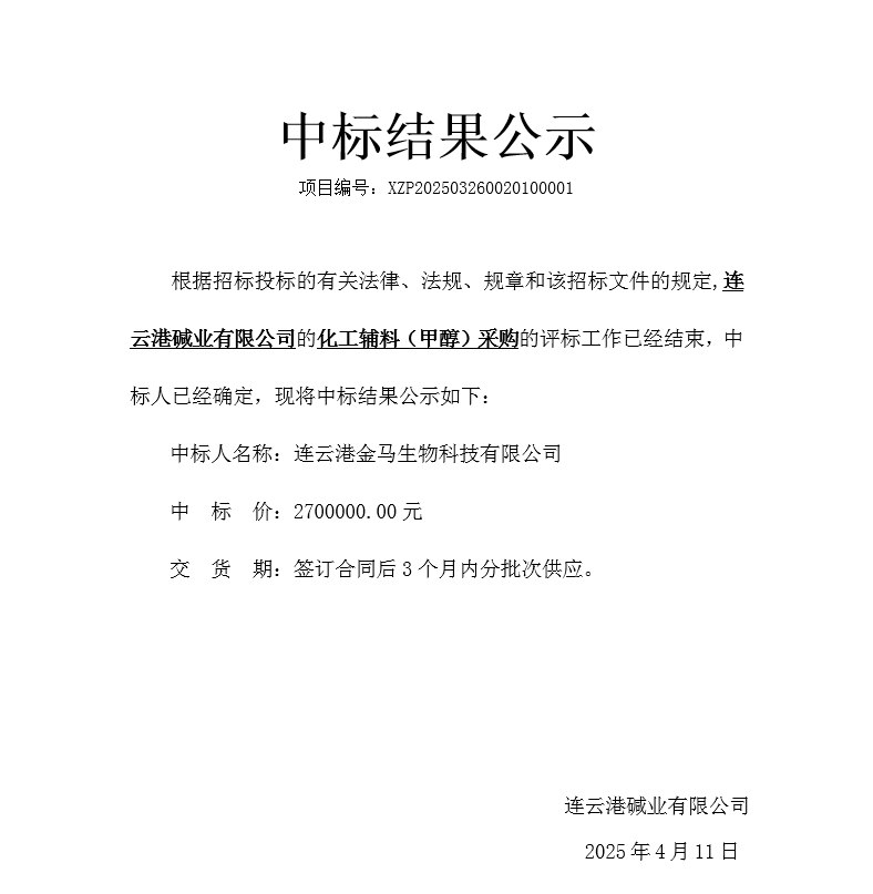 化工輔料(甲醇)采購(gòu)中標(biāo)結(jié)果公示