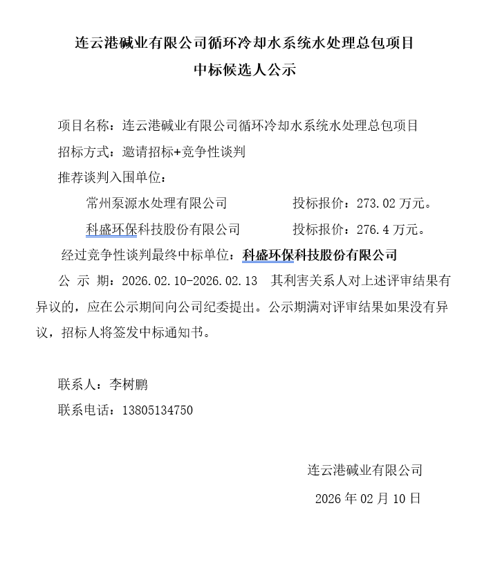 連云港堿業(yè)有限公司循環(huán)冷卻水系統(tǒng)水處理總包項(xiàng)目中標(biāo)候選人公示