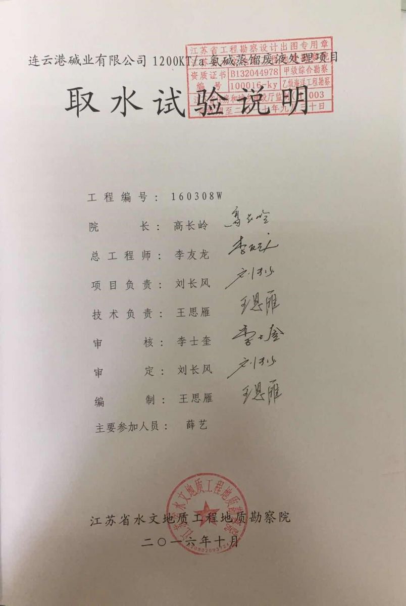 根據(jù)吉林化學工業(yè)公司設計院《連云港堿廠環(huán)境影響報告書》和原江蘇省環(huán)境保護局《關于對連云港堿廠環(huán)境影響報告書的批復》(蘇環(huán)管〔86〕31號)的要求,連云港堿廠產生的廢液送至渣場,經澄清后,上清液經自有排口閘直接排海。1997年,根據(jù)淮河流域水污染防治的要求,連云港市環(huán)保局向連云港堿廠下達了《關于淮河流域水污染源限期達標排放的決定》(連環(huán)管〔1997〕16號)。據(jù)此,連云港堿廠與臺北鹽場合作開發(fā)了“堿渣場上清液回收利用工程”項目,利用上清液制鹽、制鈣。1998年3月27日,該項目通過連云港市環(huán)保局組織的環(huán)保驗收,正式運行。