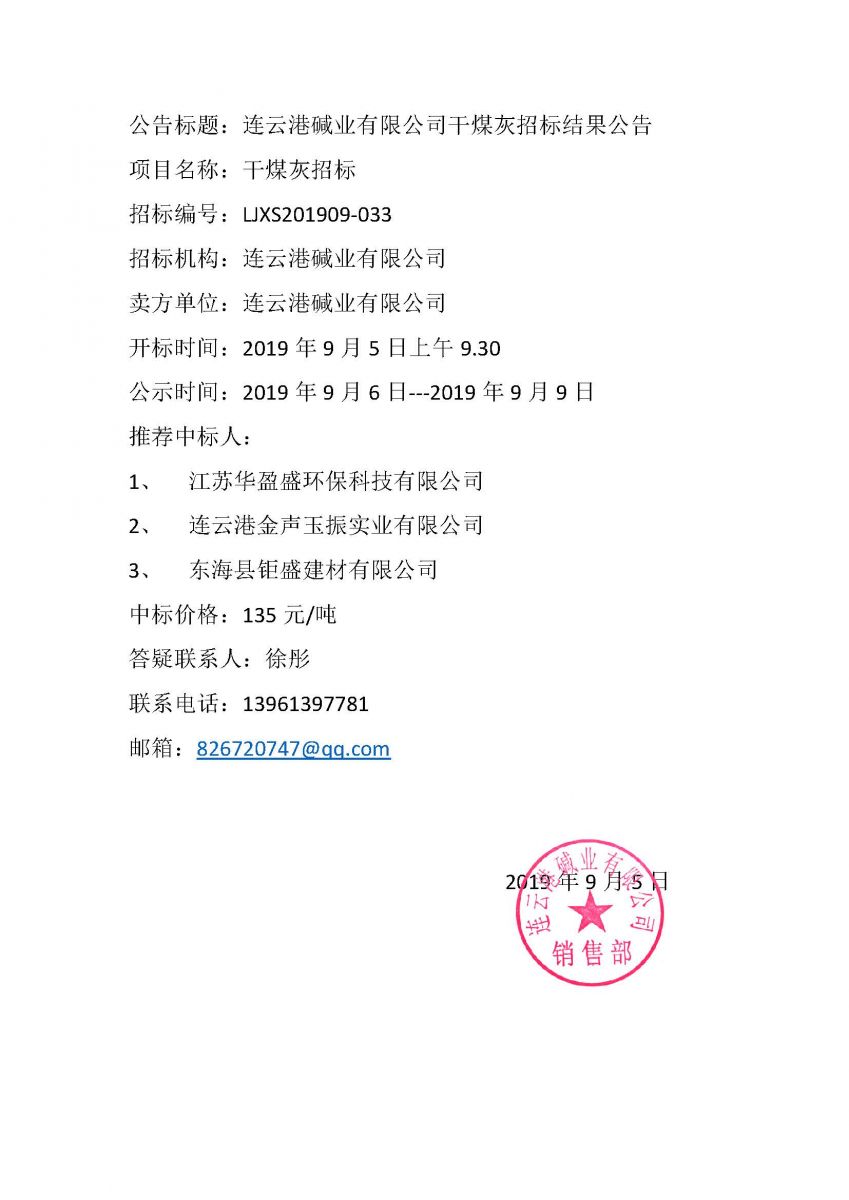 連云港堿業(yè)有限公司干煤灰招標結(jié)果公告