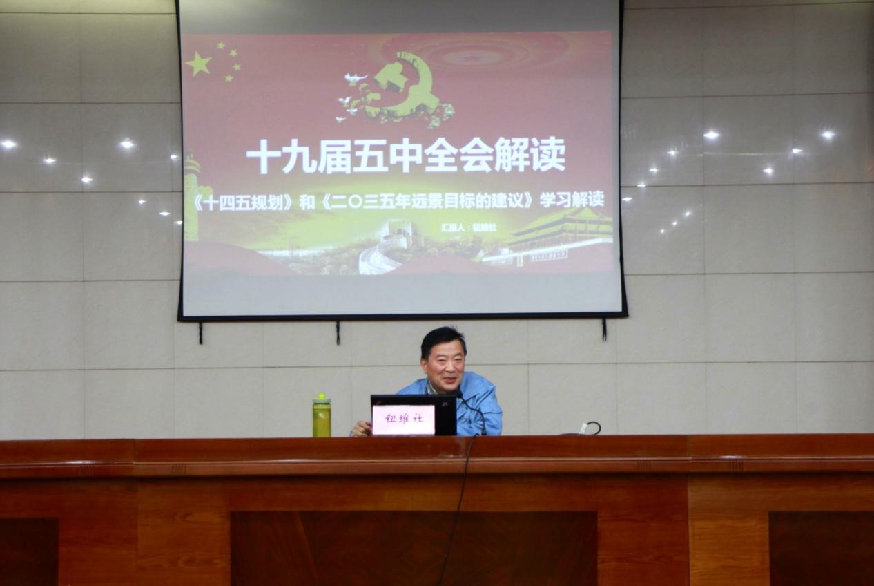 會上,鈕維社從“十九屆五中全會簡介”、“全會召開的背景和意義”、“回眸與展望”、“二0三五年遠景目標(biāo)”、“十四五規(guī)劃”五個方面,結(jié)合具體事例,用通俗易懂的語言進行了全面準(zhǔn)確的闡述,對我們認(rèn)真領(lǐng)會、準(zhǔn)確把握十九屆五中全會精神實質(zhì)具有十分重要的意義。