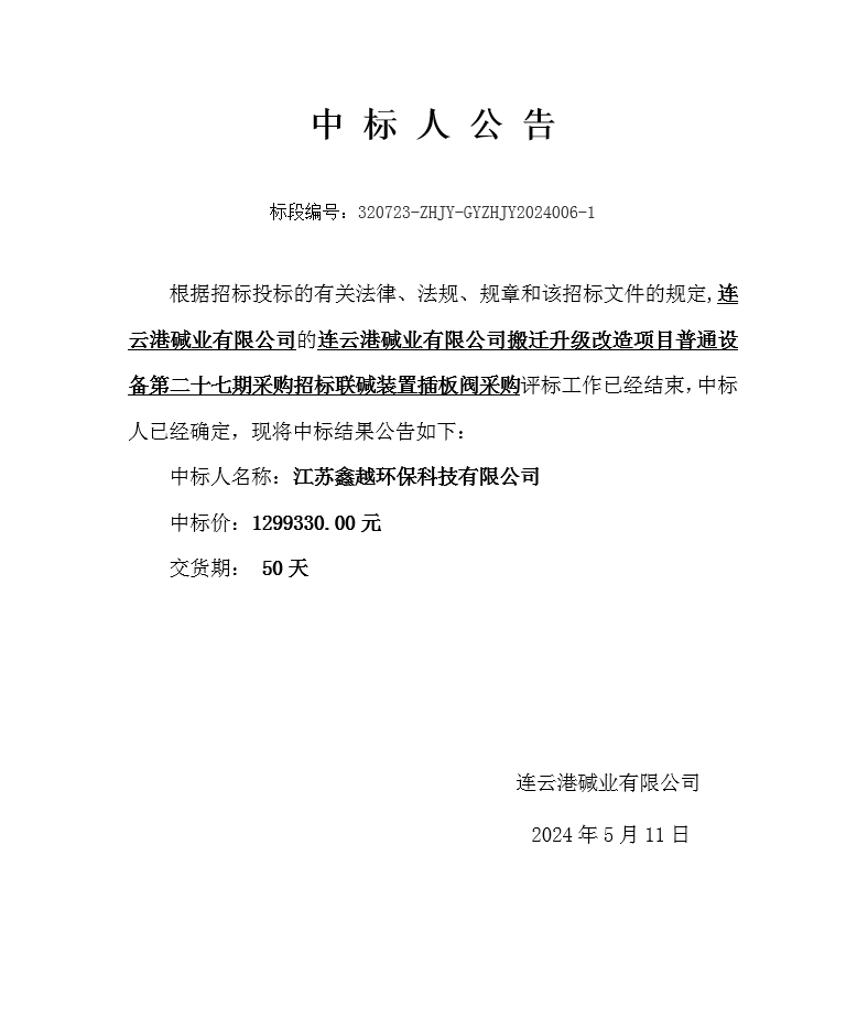 搬遷升級改造項目普通設(shè)備第二十七期采購招標(biāo)聯(lián)堿裝置插板閥采購中標(biāo)人公告