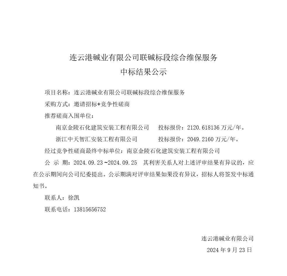 聯堿標段綜合維保服務中標結果公示