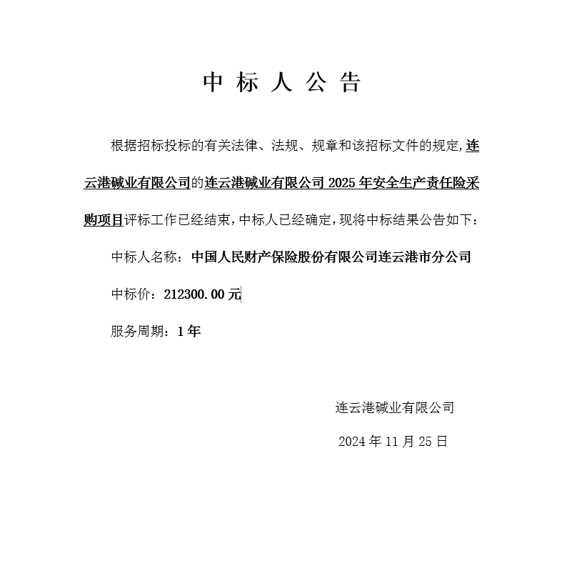 連云港堿業(yè)有限公司2025年安全生產(chǎn)責(zé)任險采購項目中標人公告
